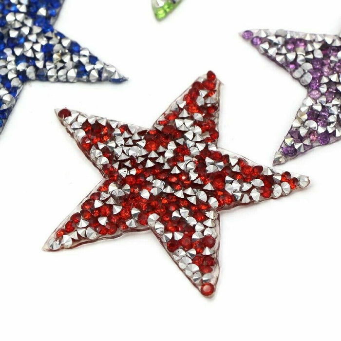 Sparkly shiny rhinestone star patches, made from hotfix these stars are brilliant for personalising adults and children's clothing, soft furnishings and other apparel. They are available in various colours and each colour is mixed with a sparkling silver stone.