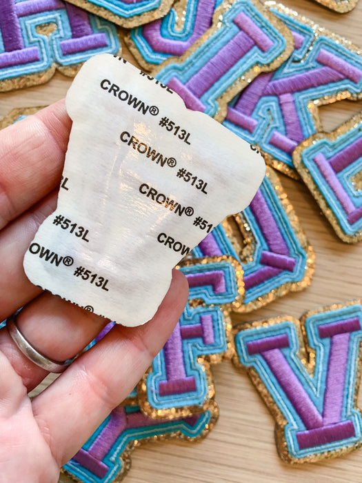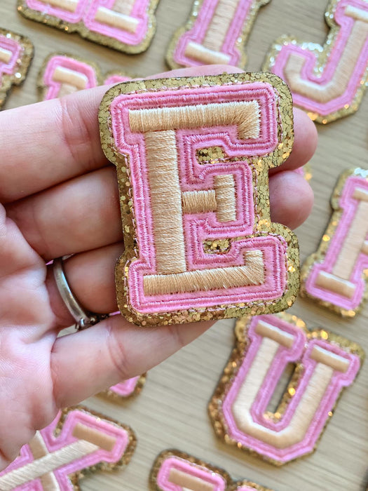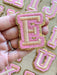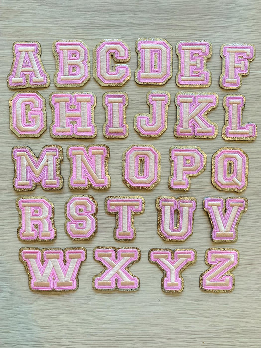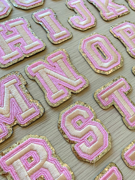 Gold letter patches with a pink and shiny gold edging. These embroidered patches will add colour to your clothes and other items such as hats and bags. They have a sticky backing which allows for easy positioning to iron the patches in place.
