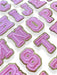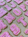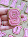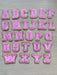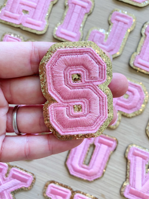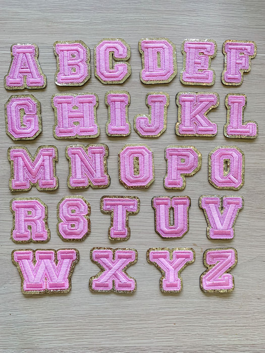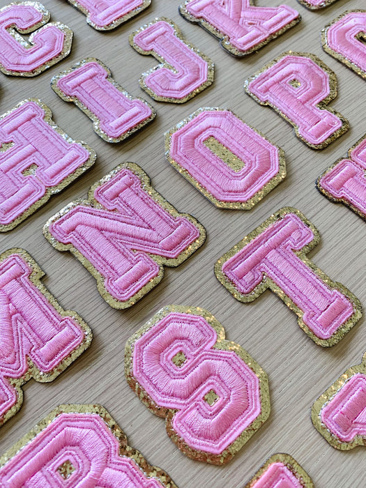 Pink letter patches with a shiny gold edging. These embroidered patches will add colour to your clothes and other items such as hats and bags. They have a sticky backing which allows for easy positioning to iron the patches in place.