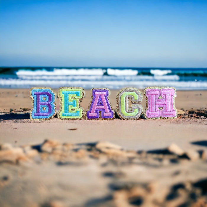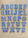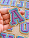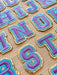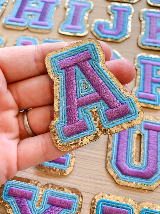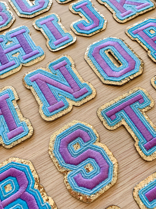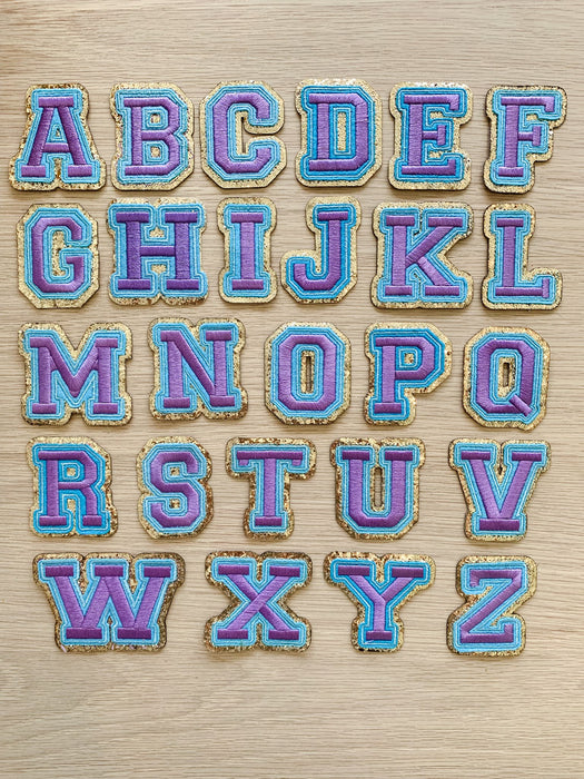 Purple letter patches with a blue and shiny gold edging. These embroidered patches will add colour to your clothes and other items such as hats and bags. They have a sticky backing which allows for easy positioning to iron the patches in place.
