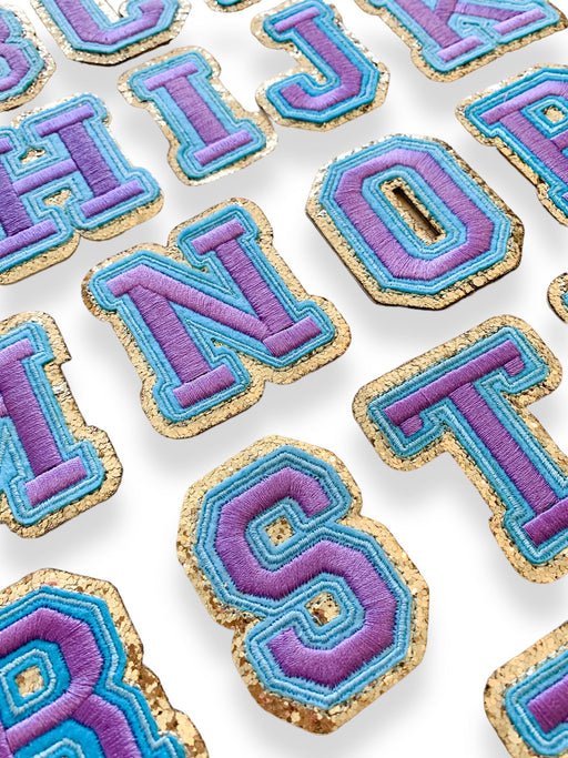 Purple letter patches with a blue and shiny gold edging. These embroidered patches will add colour to your clothes and other items such as hats and...