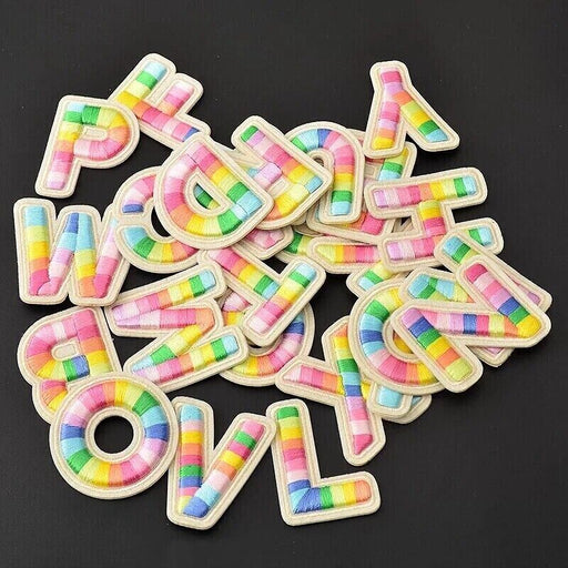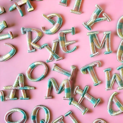 3cm striped multi colour embroidered letter patches. Mixtures of colour from yellow, pink, gold and green. These patches are suitable for sewing a...