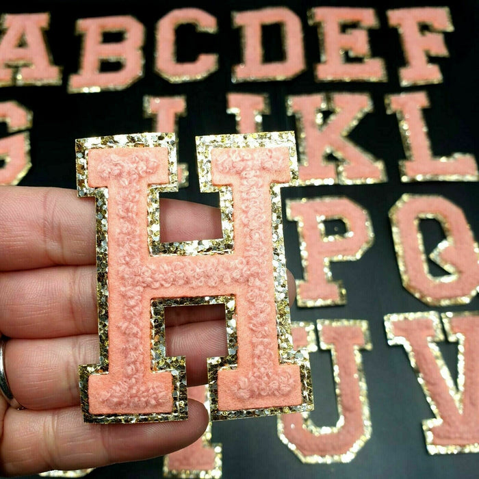 Light Pink college font chenille iron-on letter patches with a sparkly gold trim backing, these patches are perfect for wide range of personalisation projects.