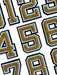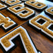 With a bold varsity font these iron-on Brown chenille number patches are simply exquisite with a 3D effect contrasting black and white felt backing.