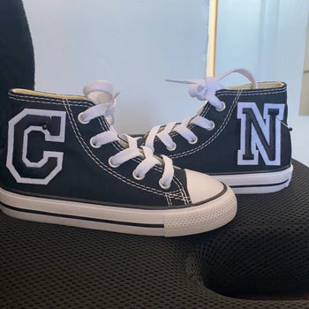 Large black varsity style font embroidered number patches. Each letter has a white border which helps make them stand out, even on a darker background.
