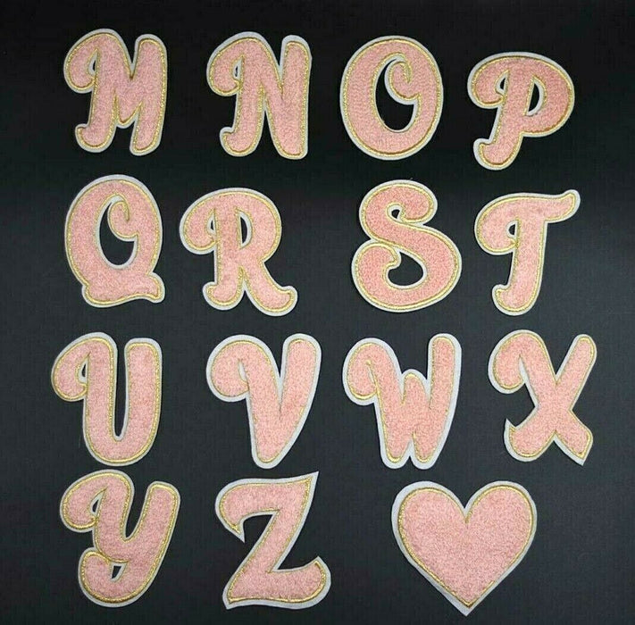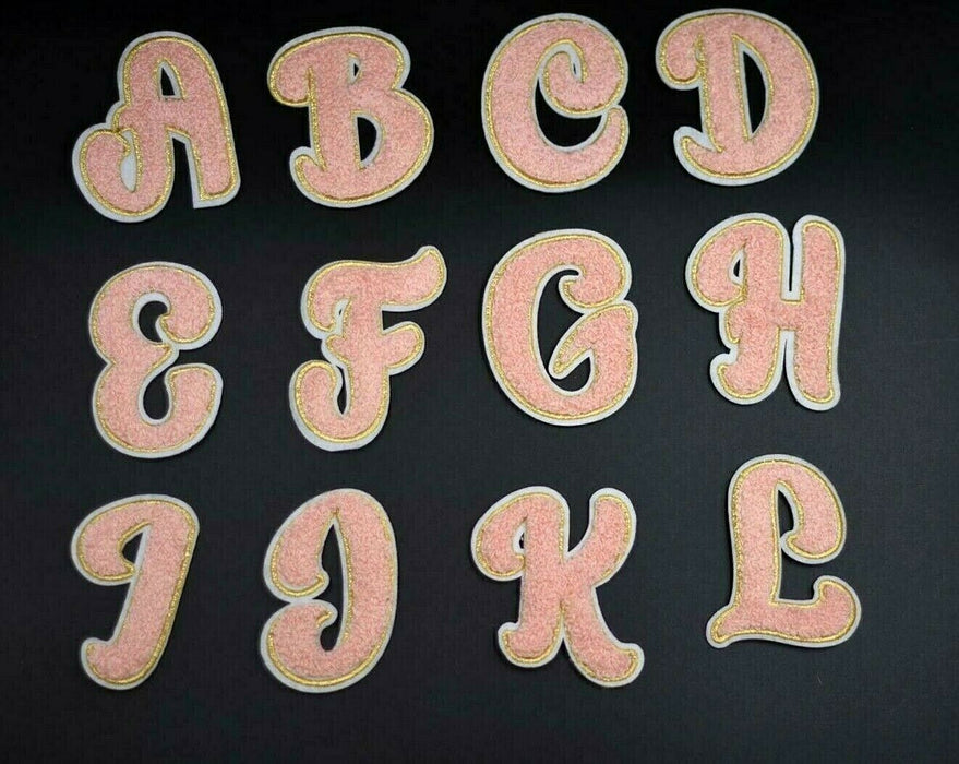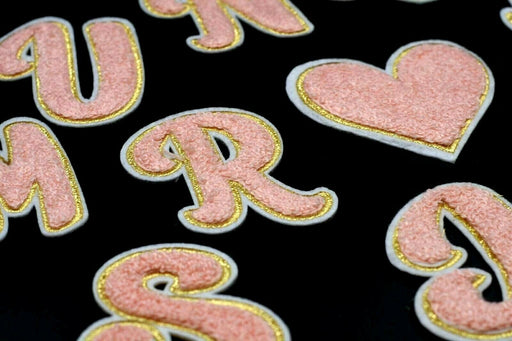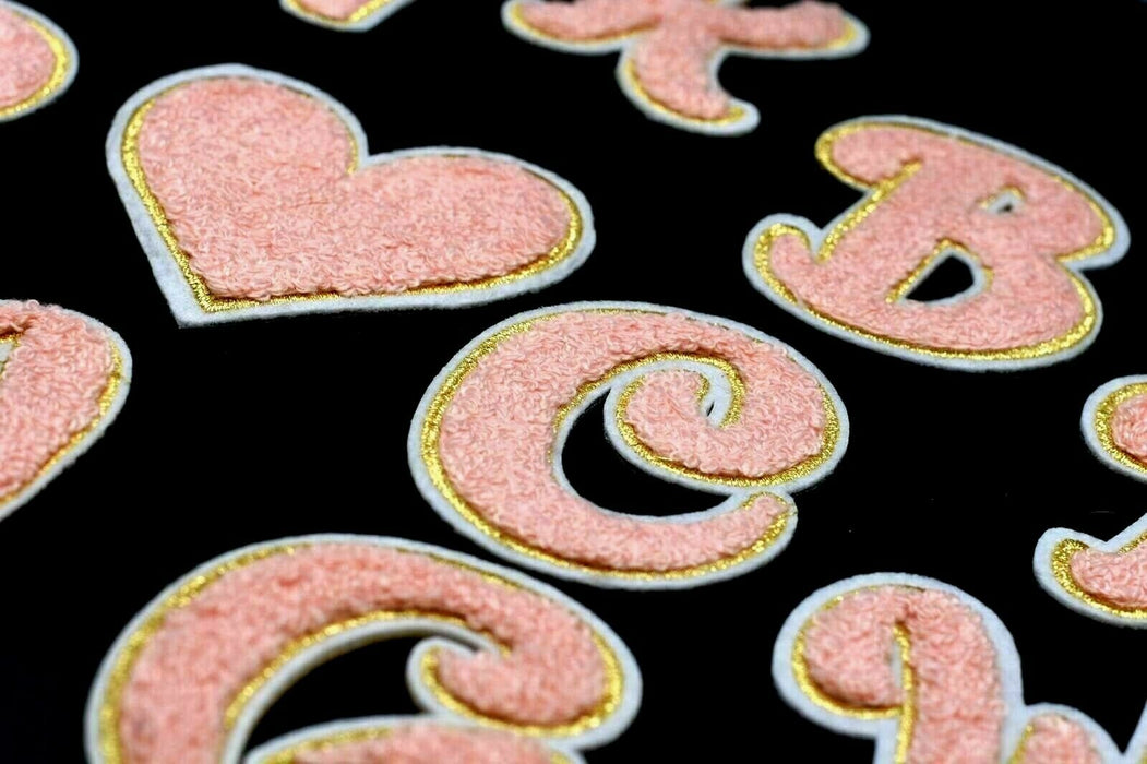 A pink chenille letter patch with a fine gold threaded trim, these letter patches are fantastic for adding that special touch to your clothes.