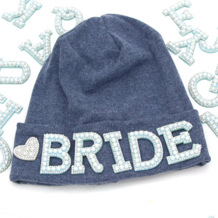 Beautiful white faux pearl patches with a glittering border of silver rhinestones on a blue contrasting background. These pearl letter patches are just perfect for wedding party apparel and projects that call for that little touch of glamour!