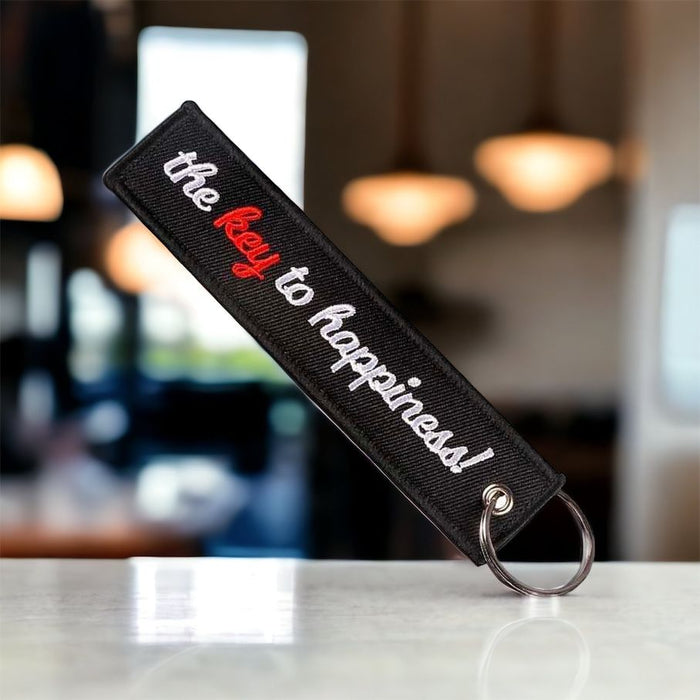 Fantastic quality embroidered luggage tag / motorbike keyrings with the words "The Key To Happiness".
